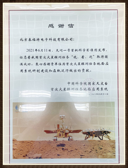 2021年6月11日,天問一號首批科學影像圖發布,標志著我國***火星探測任務“繞、著、巡”取得圓滿成功。衷心感謝貴單位為***火星探測任務地面應用系統研制建設和在軌運行做出的貢獻!